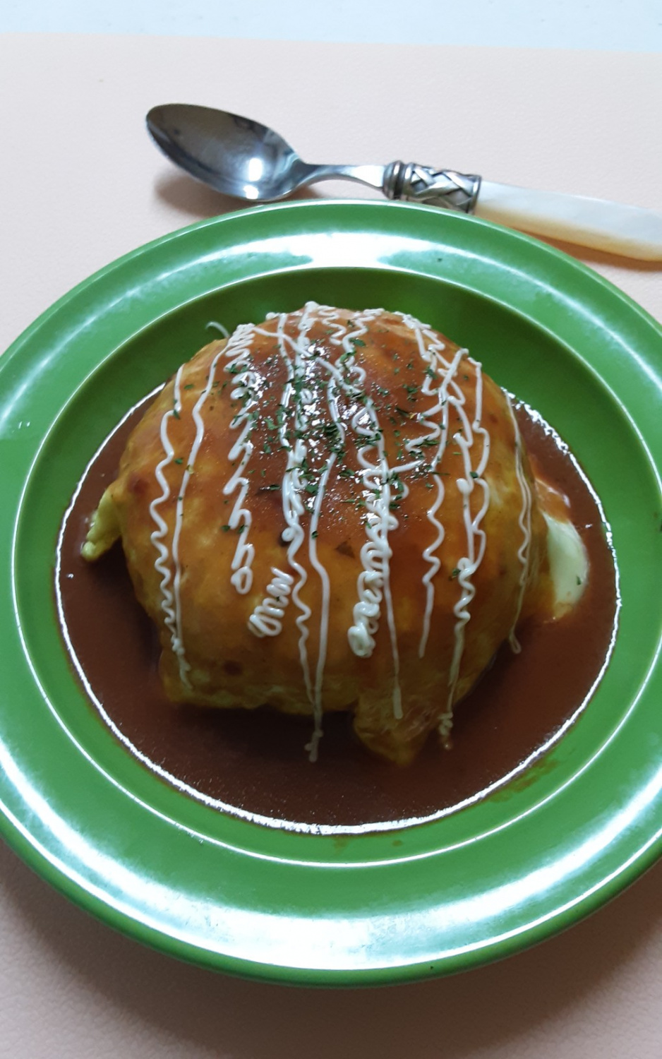 마지막으로 취향에 따라 마요네즈를 지그재그로 뿌려주고, 파슬리 가루를 솔솔 뿌려주면 먹음직스러운 오므라이스 완성입니다! 따뜻할 때 바로 드시면 더욱 맛있어요.