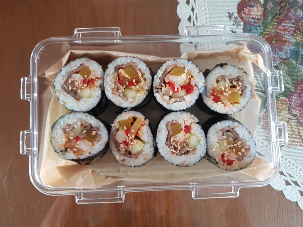 아침 식사로 든든하게 즐길 수 있는 우삼겹 김밥입니다. 포장해서 직장 동료들과 나누어 먹기에도 손색없어요!