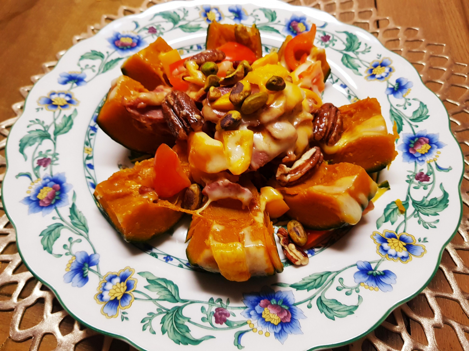 전자레인지에서 꺼낸 단호박찜은 치즈가 노릇하고 먹음직스럽게 잘 익어 있어요. 김이 모락모락 나는 따뜻할 때 즐기면 더욱 맛있답니다.