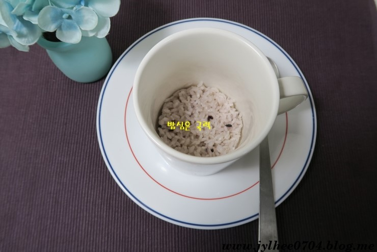 먼저, 밥을 지을 머그컵에 흰쌀 3큰술을 계량해 담아주세요. 1인분의 적당한 양입니다.