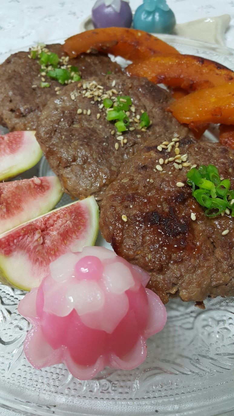 잘 구워진 떡갈비와 단호박을 보기 좋게 접시에 담아냅니다. (이때 새송이버섯 대신 준비한 무화과를 함께 담았습니다.) 마지막으로 떡갈비 위에 참깨나 잣과 같은 고명을 솔솔 뿌려주면 더욱 먹음직스러운 떡갈비를 완성할 수 있습니다.