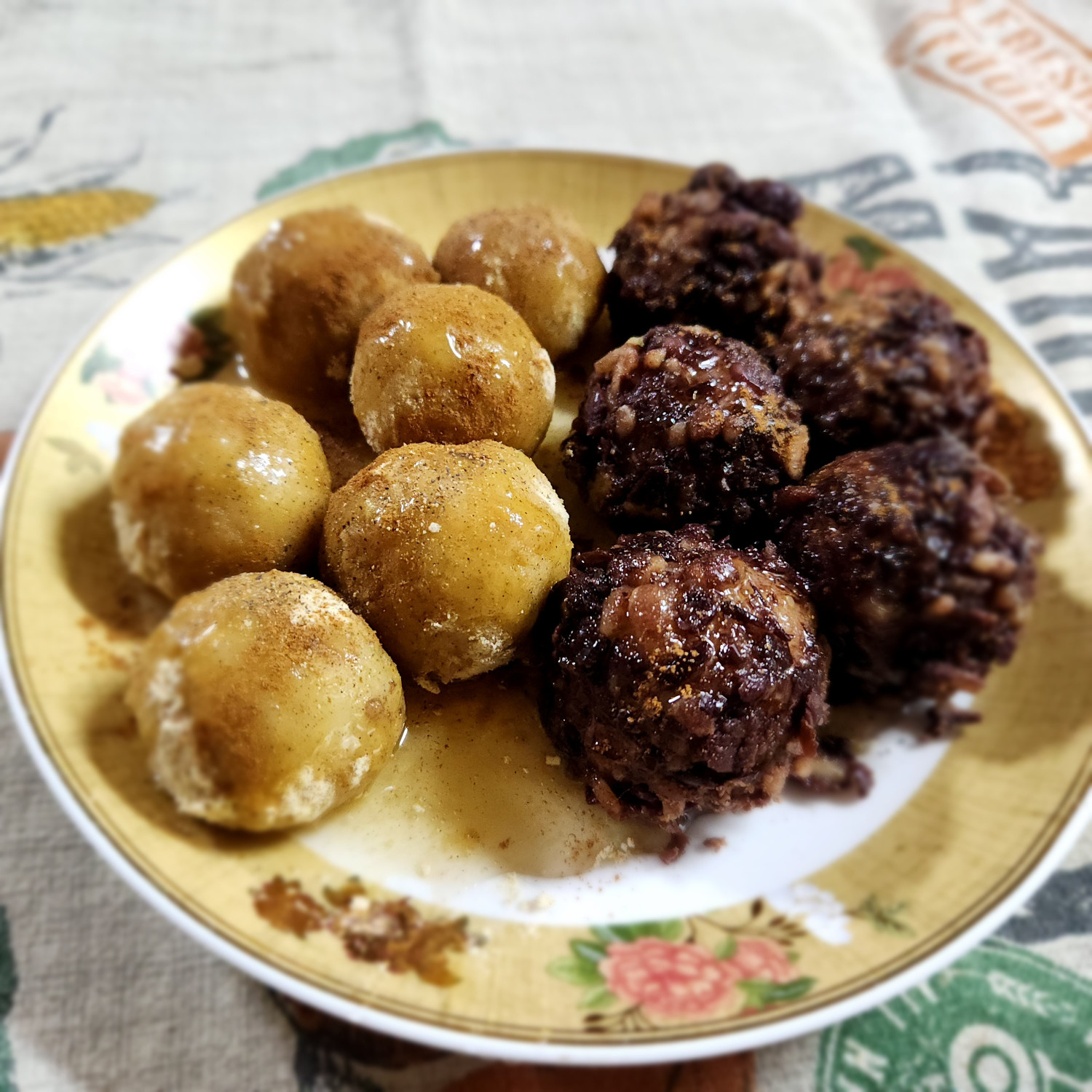 마지막으로 경단 위에 준비해둔 달콤한 꿀 생강 시럽을 보기 좋게 뿌려줍니다. 그 위에 향긋한 계핏가루와 알싸한 후추를 살짝 뿌려주면, 맛과 향이 어우러진 특별한 콩 경단이 완성됩니다! 맛있게 즐기세요.
