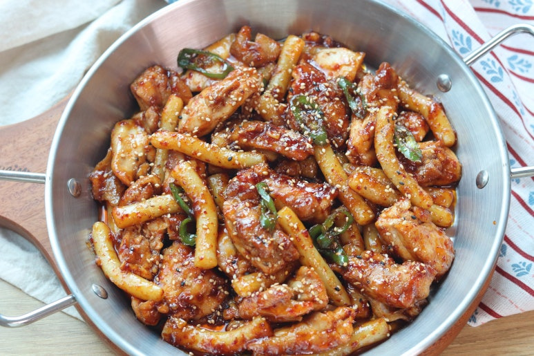 양념이 닭고기에 잘 스며들기 시작하면, 말랑한 밀떡과 매콤함을 더해줄 청양고추를 넣고 함께 볶아주세요. 떡이 말랑해지고 양념이 졸아들 때까지 2~3분 정도 더 볶아주면 됩니다.