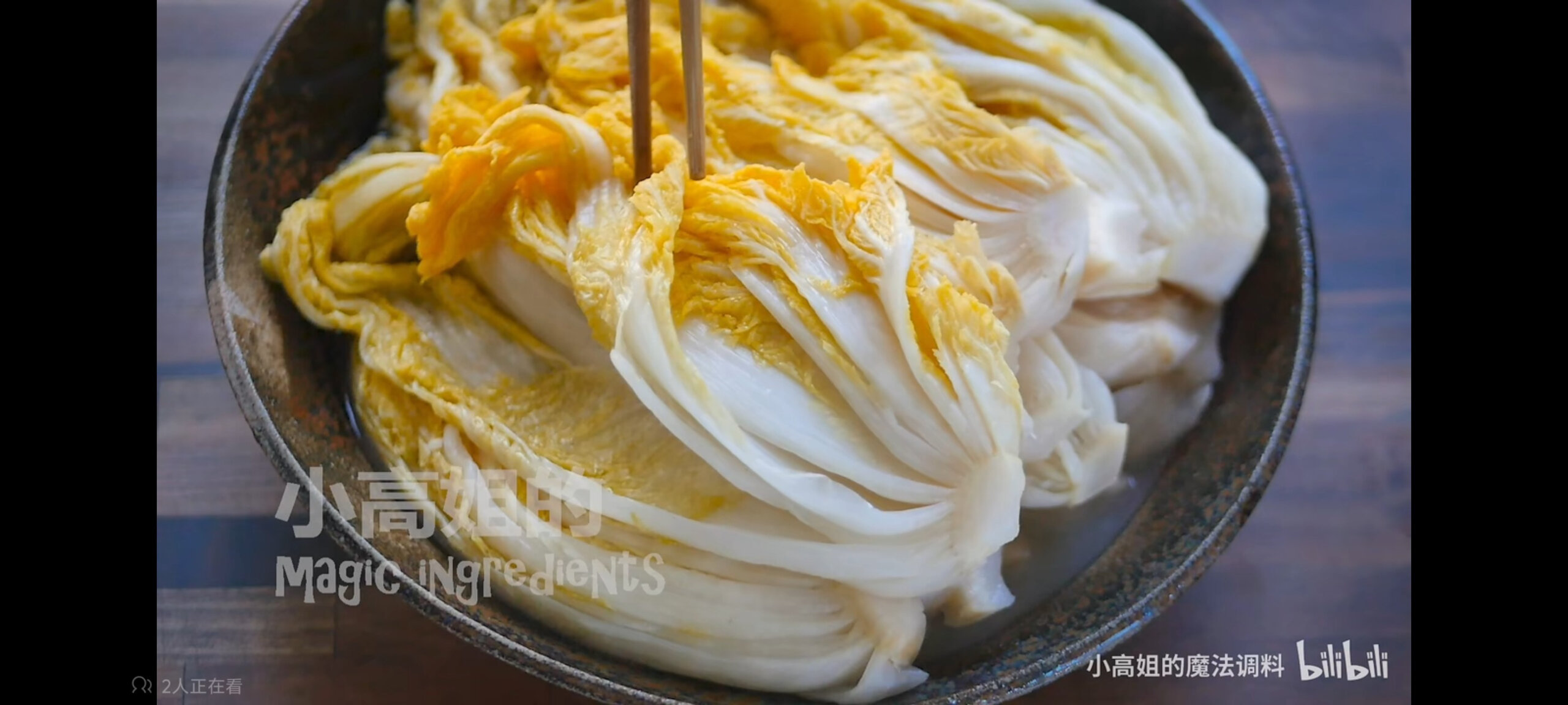 하루 동안 실온에 두면 배추가 더욱 부드러워지면서 절임돌이 자연스럽게 아래로 내려가고, 배추에서 물이 넉넉하게 생겨날 것입니다. 깨끗하게 손을 씻은 뒤, 절임돌을 꾹꾹 눌러 배추가 완전히 물에 잠기도록 해주세요. 만약 배추에서 나온 물의 양이 부족하여 배추가 완전히 잠기지 않는다면, 끓는 물 1리터에 정제염 20g (2% 농도)을 녹인 소금물을 만들어 5분간 끓여 살균한 뒤 완전히 식혀서 사용합니다. 이 소금물을 유리병에 가득 부어 배추를 완전히 잠기게 해야 합니다. 병 안의 공기를 최대한 빼주어야 표면에 흰색 막이 생기는 것을 방지할 수 있습니다. 만약 흰색 막이 생기더라도 인체에는 무해하니 걱정하지 않으셔도 됩니다. 마지막으로 뚜껑을 단단히 닫아 밀봉합니다.