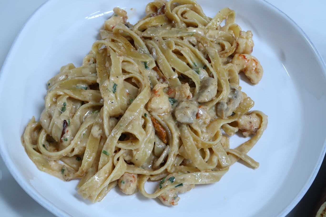 소스가 면에 충분히 배어들고 꾸덕한 농도가 되면 맛있는 투움바 파스타 완성입니다! 따뜻할 때 바로 접시에 담아 맛있게 즐겨주세요. 빵이나 샐러드를 곁들이면 더욱 풍성한 식사를 할 수 있답니다.