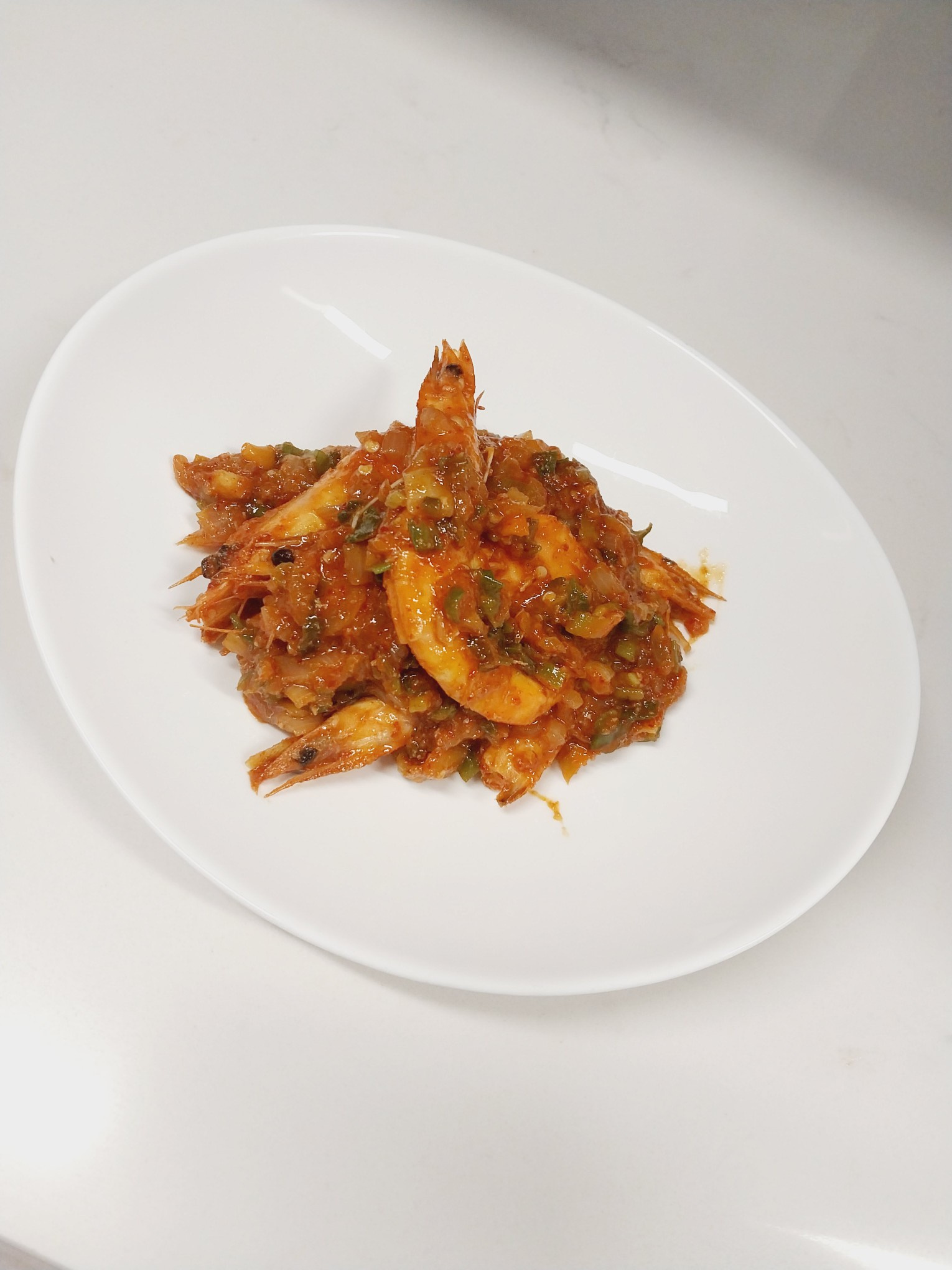 채 썰어둔 청양고추를 넣고, 새우에 소스가 골고루 잘 스며들도록 주걱으로 뒤적이면서 약 2-3분간 더 졸여주세요. 소스가 자작하게 졸아들고 새우에 윤기가 돌면 완성입니다. 밥 위에 얹어 덮밥으로 즐겨도 아주 맛있어요!