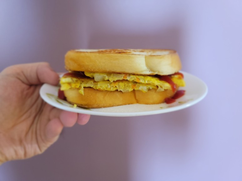 잘 구워진 식빵 한쪽 위에, 앞서 만들어둔 야채 계란 지단을 큼직하게 얹어줍니다. 그 위에 새콤달콤한 케첩을 취향껏 뿌리고, 달콤한 설탕 1/2 테이블스푼을 솔솔 뿌려주세요. 마지막으로 남은 식빵 한 장으로 덮어주면, 맛있는 야채 토스트가 완성됩니다. 꾹꾹 눌러주면 재료들이 잘 어우러져요.