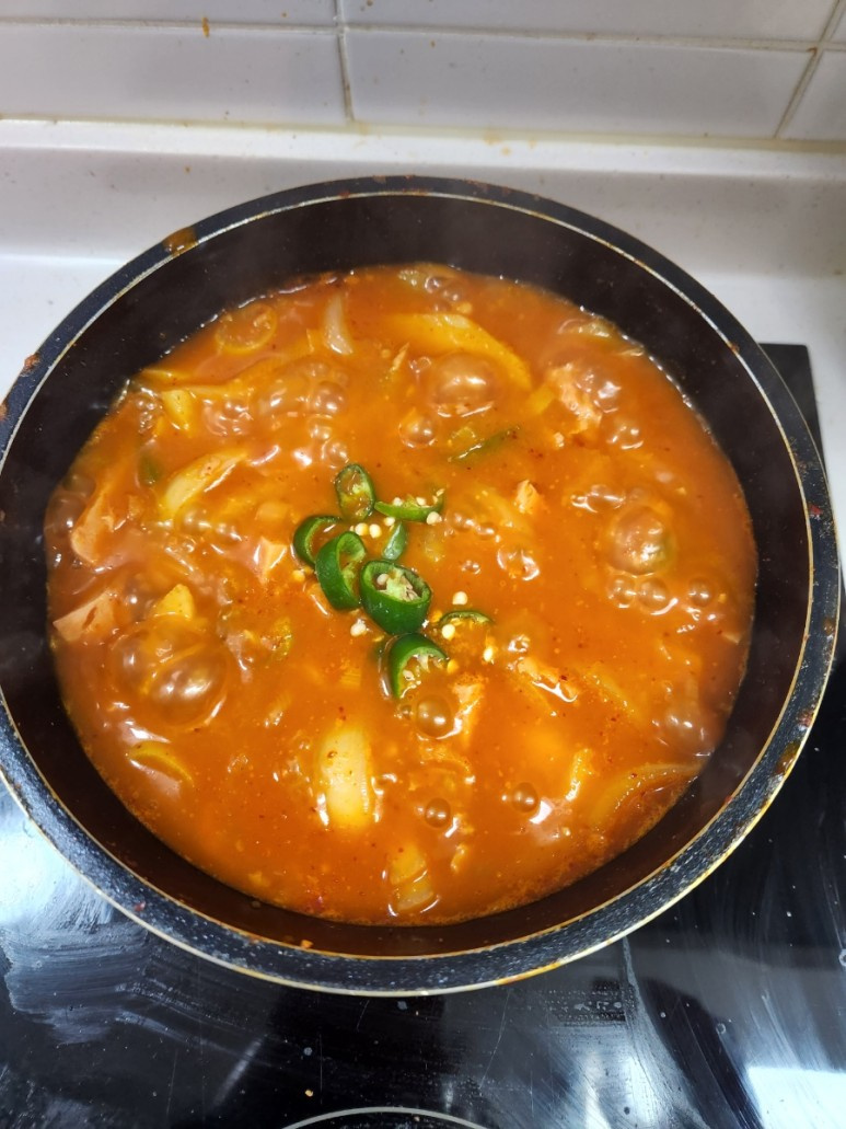물을 부을 차례입니다. 물의 양은 스팸이 잠길랑 말랑할 정도로, 즉 스팸 윗부분이 살짝 보일 정도로만 넣어주세요. 물이 너무 많으면 국물 맛이 싱거워질 수 있습니다.