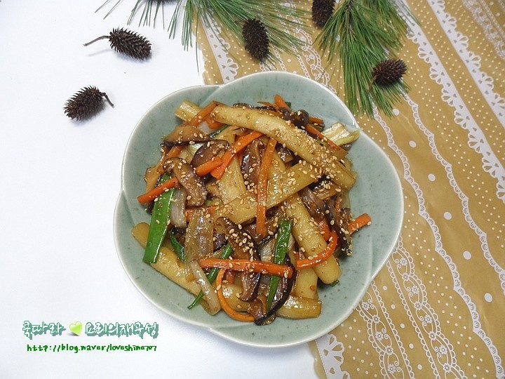 불을 끄기 직전에 참기름 약간과 후추를 살짝 뿌려 향을 더하고, 깨소금을 솔솔 뿌려주면 맛있는 떡잡채가 완성됩니다! 따끈할 때 바로 드시면 더욱 맛있어요.