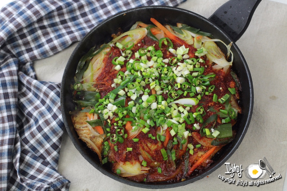 뒤집은 고등어 위에 채 썰어둔 양파를 먼저 올리고, 이어서 당근과 대파를 보기 좋게 올려줍니다. 양파의 은은한 단맛과 대파의 알싸한 향이 고등어와 어우러져 정말 깊고 맛있는 풍미를 더해줄 거예요. 불은 계속 중간불 이하로 유지해 주세요.