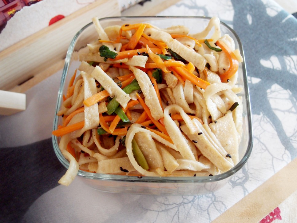 달궈진 팬에 식용유 4큰술을 넉넉히 두르고, 채 썬 당근을 먼저 넣어 살짝 볶아주세요. 당근이 어느 정도 익으면 채 썬 어묵과 쪽파를 넣고 함께 볶아줍니다. 어묵이 팬에 달라붙지 않도록 중간중간 저어주세요.
