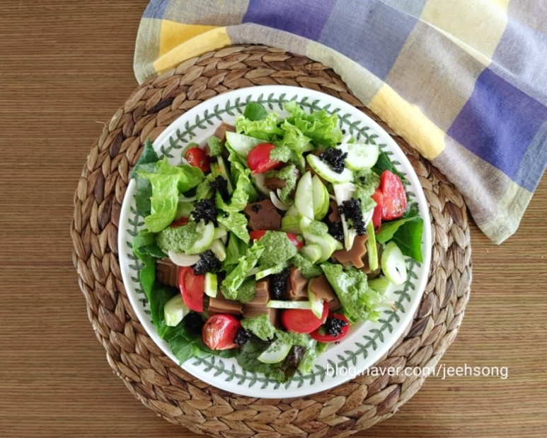 마지막으로 돌나물 드레싱과 블랙 올리브 꿀절임을 숟가락으로 떠서 샐러드 위에 드문드문 얹어주세요. 드레싱은 취향에 따라 좋아하는 다른 드레싱으로 대체해도 좋습니다. 신선한 채소와 쫄깃한 도토리묵, 그리고 풍미 가득한 토핑이 어우러져 건강하고 맛있는 한 끼가 완성됩니다.