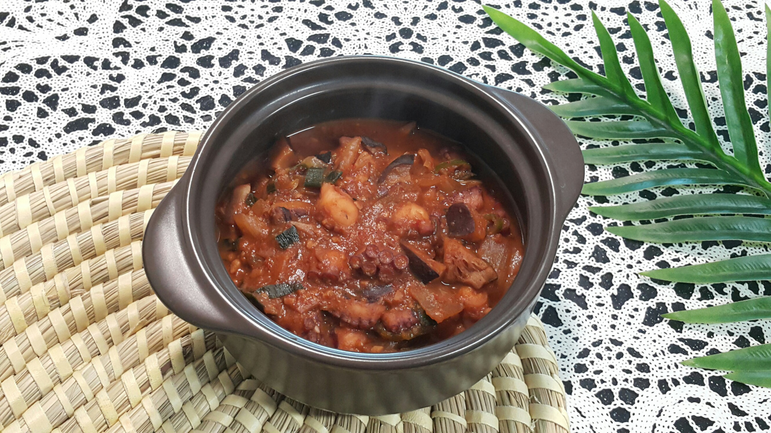 냄비에 준비된 채소와 문어, 그리고 양념 재료를 모두 넣고 숟가락으로 골고루 저어가며 양념이 잘 풀어지도록 섞어줍니다.