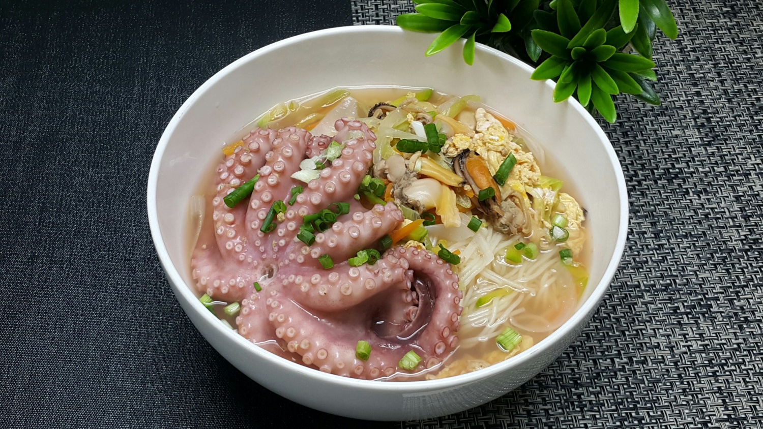 쫄깃한 발문어와 신선한 해물이 어우러진 맛있는 해물 국수