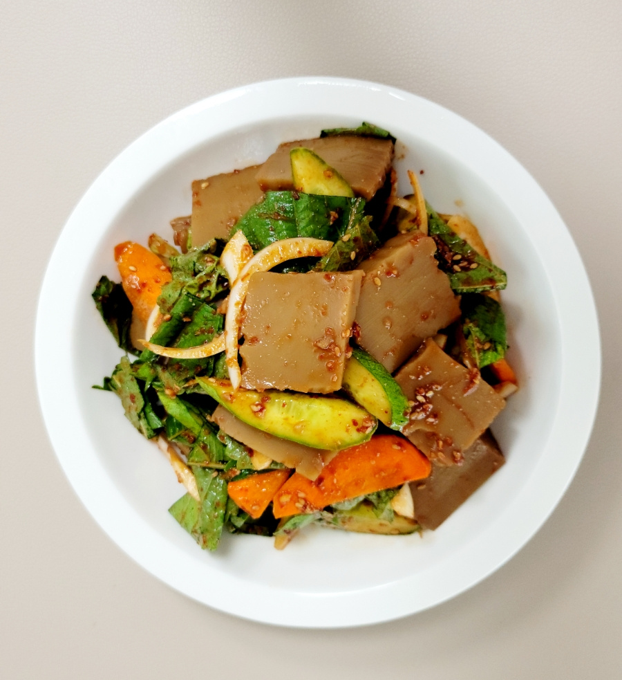 쫄깃한 도토리묵과 아삭한 채소가 어우러진 맛있는 도토리묵 무침이 완성되었습니다! 보기에도 좋고 맛도 좋은 최고의 반찬, 맛있게 즐기세요.