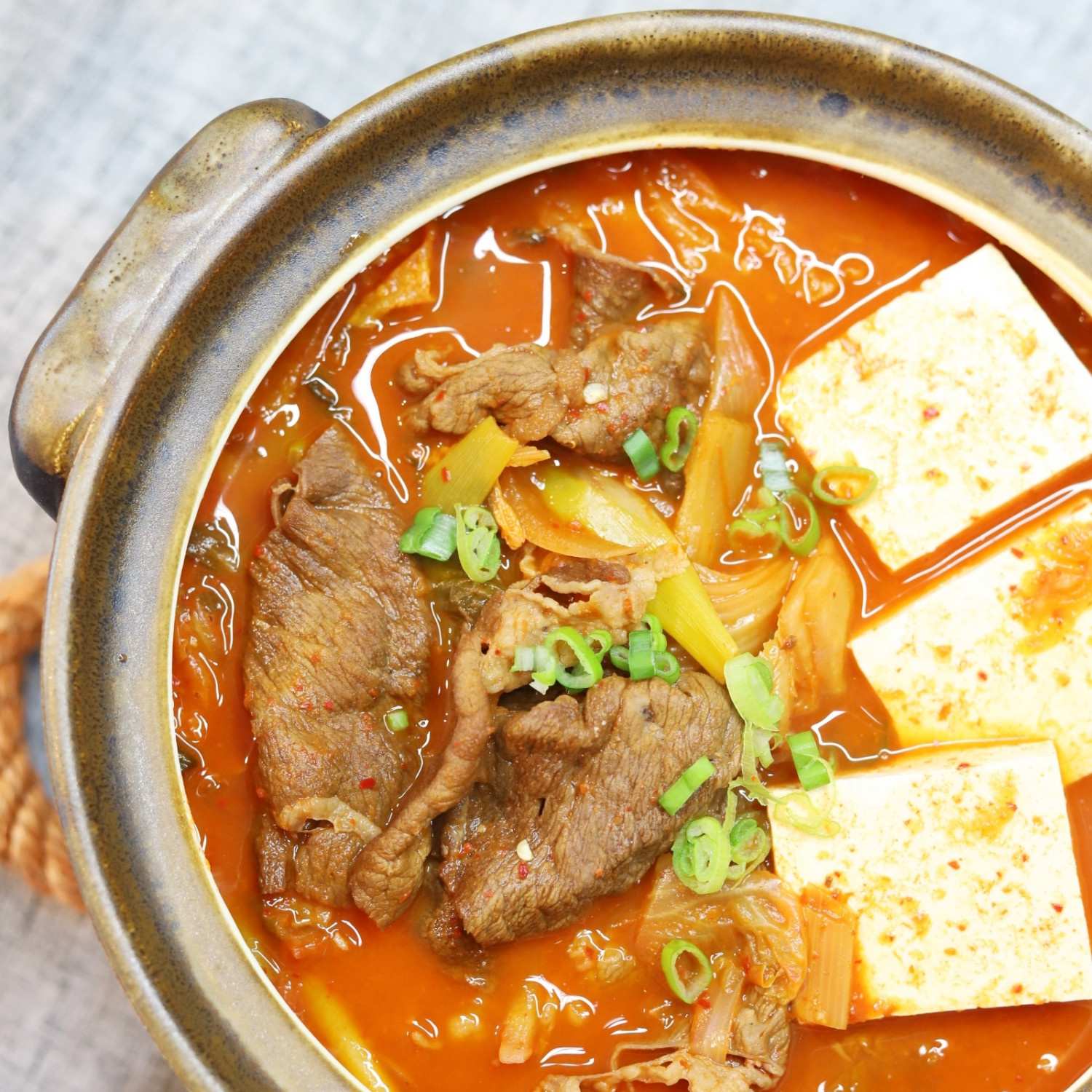 이제 맛있게 끓여진 김치찌개를 그릇에 넉넉하게 담아주세요. 마지막으로 송송 썰어둔 파를 고명으로 얹어주면, 얼큰하면서도 깊은 풍미가 살아있는 차돌박이 김치찌개가 완성됩니다.