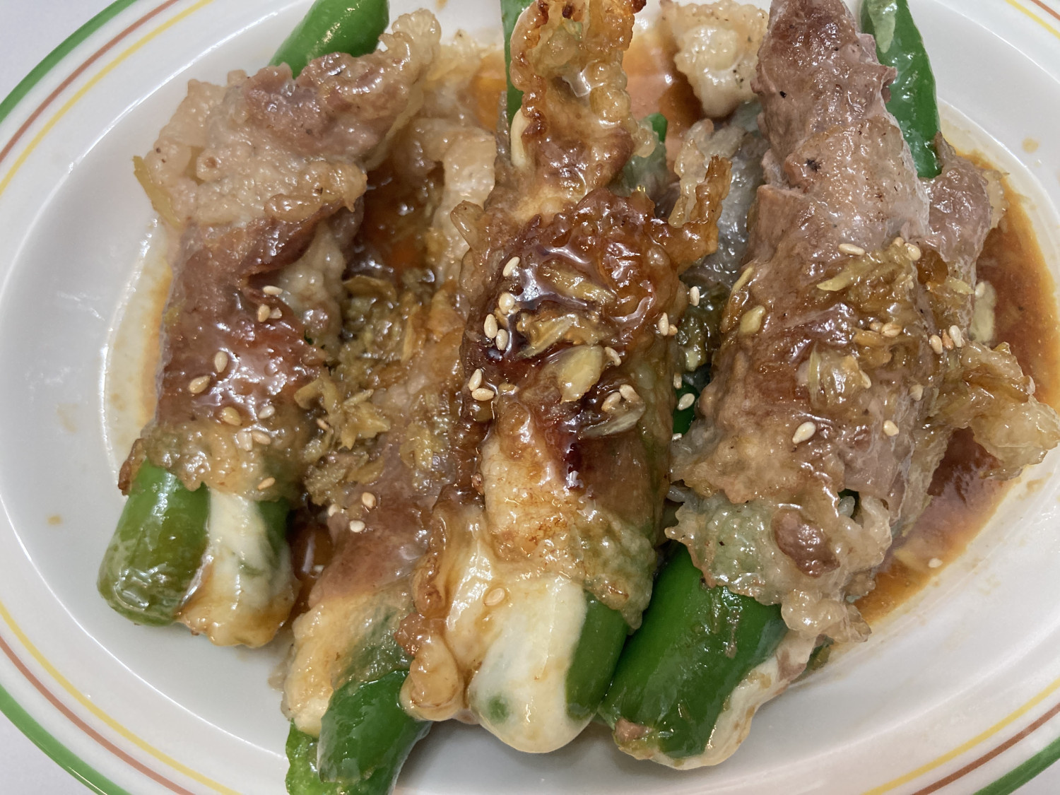이제 눈으로만 봐도 군침이 도는, 단짠의 완벽한 조화를 이룬 ‘차돌박이 치즈 고추말이’가 완성되었습니다. 한 입 베어 물면 멈출 수 없는 마성의 매력을 가진 요리랍니다.