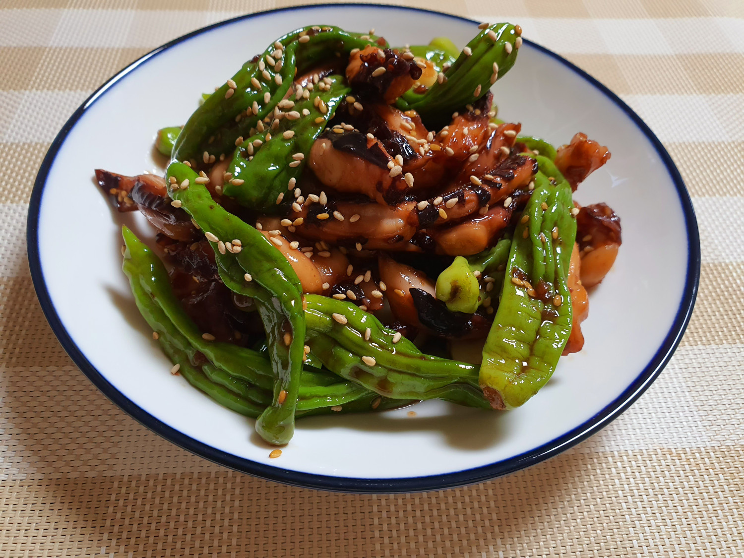 손질해둔 꽈리고추 25개를 넣고 문어와 함께 볶아주세요. 꽈리고추는 매콤한 맛과 아삭한 식감을 더해주며, 모양도 예쁘게 만들어 줄 거예요.