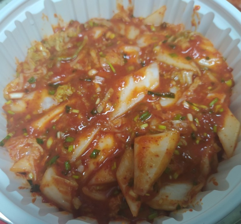 미리 만들어둔 김치 양념을 넣고 배추에 골고루 묻도록 버무려주세요. 양념이 배추에 잘 배도록 손으로 박박 무쳐주는 것이 중요합니다. 양념이 딱 맞게 완성되어 버무리기 좋네요. 이렇게 초간단 김치가 완성되었습니다!
