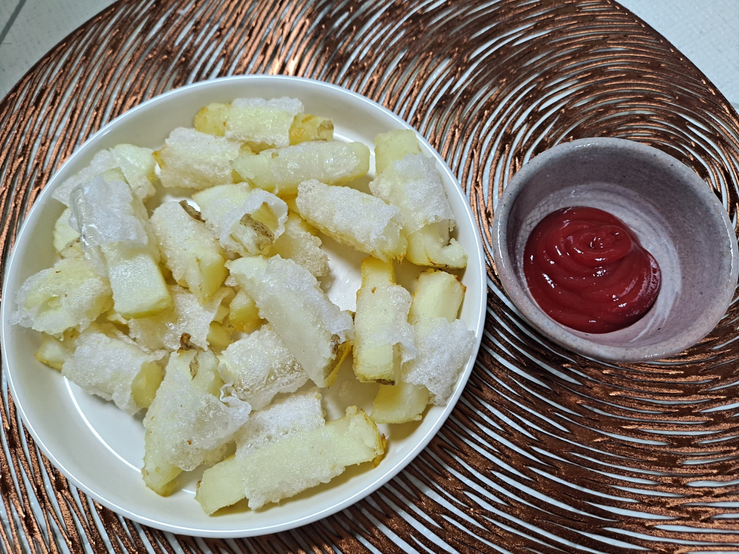 마지막으로 완성된 라이스페이퍼 감자튀김을 접시에 예쁘게 담아냅니다. 케첩이나 스리라차 소스 등 좋아하는 소스에 찍어 드시면 더욱 맛있게 즐길 수 있어요. 시원한 맥주나 탄산음료와 함께 곁들여 보세요. 근사한 홈메이드 간식이 완성됩니다!