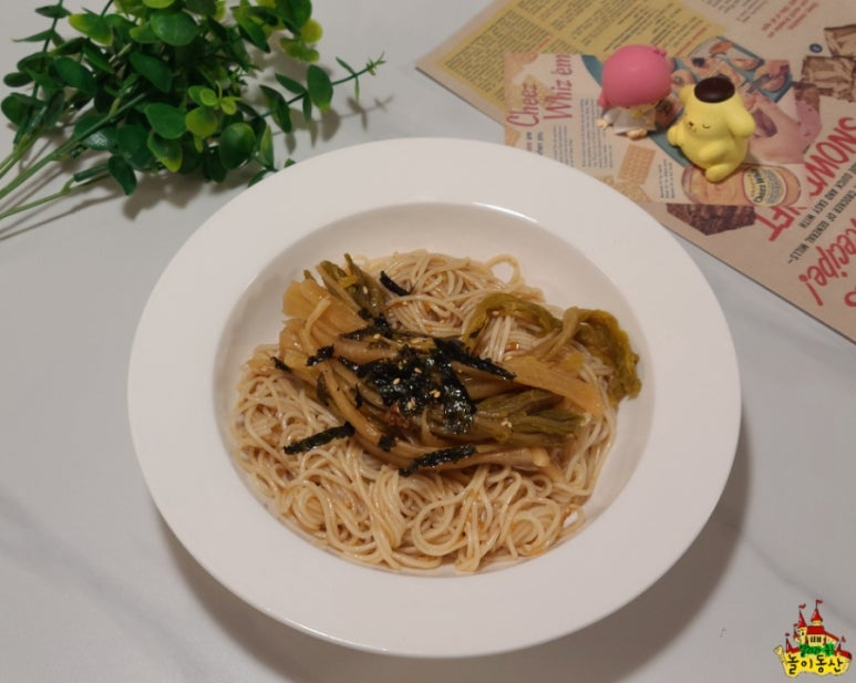 이제 모든 재료를 합쳐 맛있는 간장 비빔국수를 완성할 시간입니다! 물기를 뺀 쫄깃한 중면을 넓은 그릇에 담고, 준비해둔 양념장과 찢어 놓은 김치를 듬뿍 넣어주세요. 마지막으로 김가루와 통깨를 솔솔 뿌려주면, 맛과 비주얼 모두 잡은 류수영 표 간장 비빔국수 완성입니다! 맛있게 비벼서 즐겨보세요.