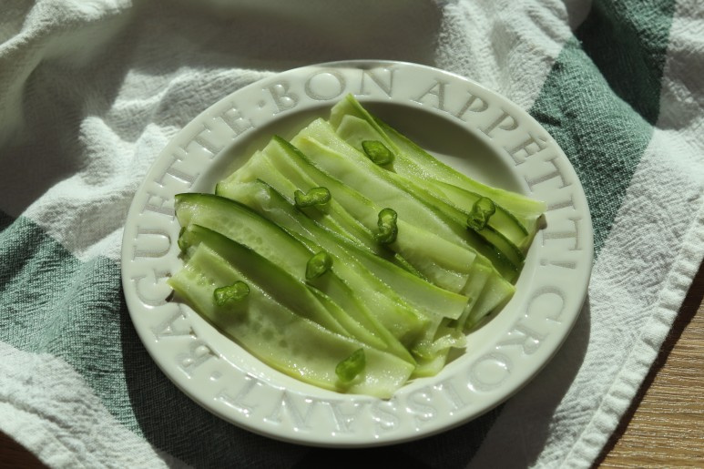 준비한 오이를 깨끗한 밀폐용기에 차곡차곡 담아주세요. 그 위에 소금 1큰술, 설탕 5큰술, 식초 7큰술을 계량해서 섞은 후 부어줍니다. 취향에 따라 매콤한 맛을 더하고 싶다면 청양고추를 송송 썰어 함께 넣어주세요.