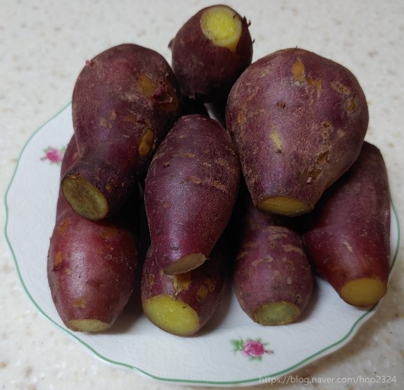 먼저 찐 고구마 만들 때 사용할 고구마를 준비해 주세요. 이렇게 바로 덜어낼 수 있도록 옆에 준비해 둡니다.