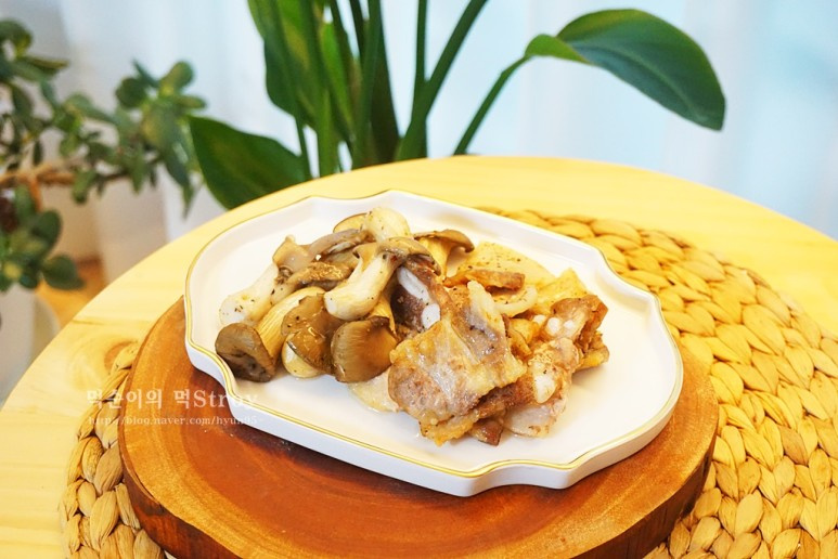 풍성한 식사를 위해 곁들임 재료도 함께 준비합니다. 저는 버섯 한 개를 준비했어요. 버섯 외에도 양파, 파프리카, 마늘 등 좋아하는 채소를 함께 구워 드시면 더욱 맛있습니다.