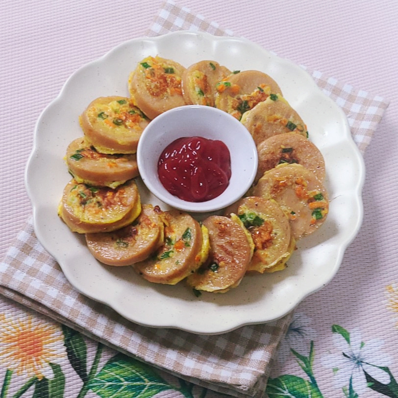 따뜻한 접시 가운데에 케첩을 담은 작은 종지를 놓고, 그 주변으로 먹음직스럽게 부쳐진 분홍 소세지전을 보기 좋게 담아냅니다. 추억의 분홍 소세지전, 맛있게 즐기세요!