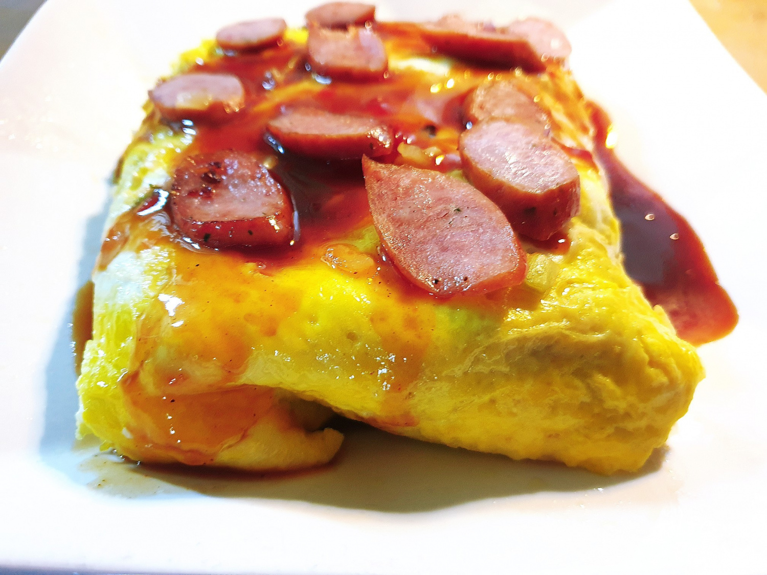 마지막으로, 볶을 때 함께 구워둔 소세지나 베이컨 조각을 오므라이스 위에 보기 좋게 장식하여 데코레이션 해주세요. 케첩으로 예쁜 무늬를 그려 넣어도 좋습니다. 추억의 맛, 소세지 베이컨 달걀 오므라이스 완성!