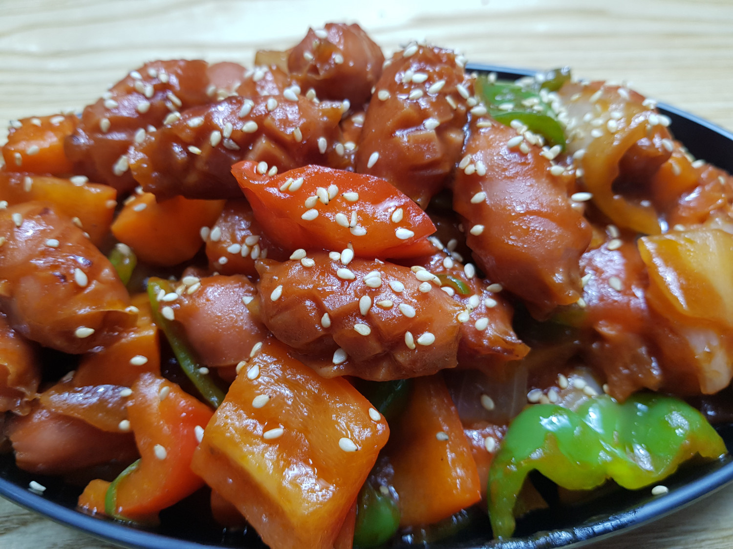 모든 재료와 소스가 잘 섞이도록 한 번 더 빠르게 볶아주면, 누구나 좋아하는 맛있는 소시지 야채볶음 (쏘야) 완성입니다! 따뜻한 밥과 함께 맛있게 즐기세요.