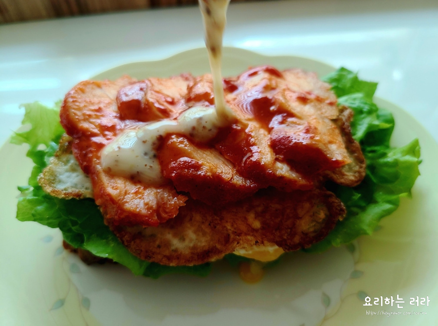 이제 빵 위에 신선한 상추를 올리고, 그 위에 부드럽게 익힌 달걀, 그리고 떡볶이 맛 닭가슴살 순서대로 차곡차곡 쌓아 올려주세요. 마지막으로 샌드위치 소스를 한 번 더 위에 휘리릭 뿌려주고, 통후추를 갓 갈아 뿌려주면 풍미가 더욱 살아나요.