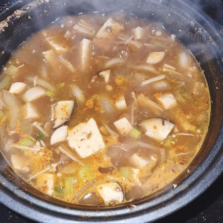 육수가 잘 우러났으면 준비해둔 팽이버섯, 송이버섯, 두부를 넣고 15분간 더 끓여줍니다. 이때 국간장 1T를 넣어 맛을 더하고, 부족한 간은 소금으로 맞춰주세요. 버섯과 두부가 부드럽게 익도록 충분히 끓여주는 것이 중요합니다.