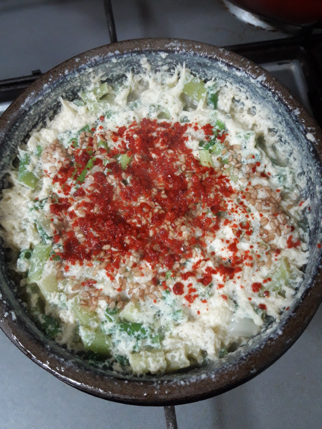약불에서 은근하게 데워진 뚝배기의 육수가 끓기 시작하면, 풀어둔 계란물을 조심스럽게 부어줍니다. 젓가락으로 바닥에 눌어붙지 않도록 살살 저어주면서 계란물이 몽글몽글 익기 시작할 때까지 저어주세요. 계란물이 어느 정도 익어서 덩어리가 잡히기 시작하면, 더 이상 젓지 마시고 바로 불을 끄고 뚝배기 뚜껑을 닫아주세요. 뚝배기의 잔열로 속까지 촉촉하게 익힐 거예요. 끓는 소리가 잦아들면 뚜껑을 열고, 준비한 깨와 고춧가루를 보기 좋게 솔솔 뿌려준 뒤, 다시 뚜껑을 덮고 1~2분 정도 뜸을 들여주세요. 이렇게 하면 맛있는 뚝배기 계란찜 완성입니다!