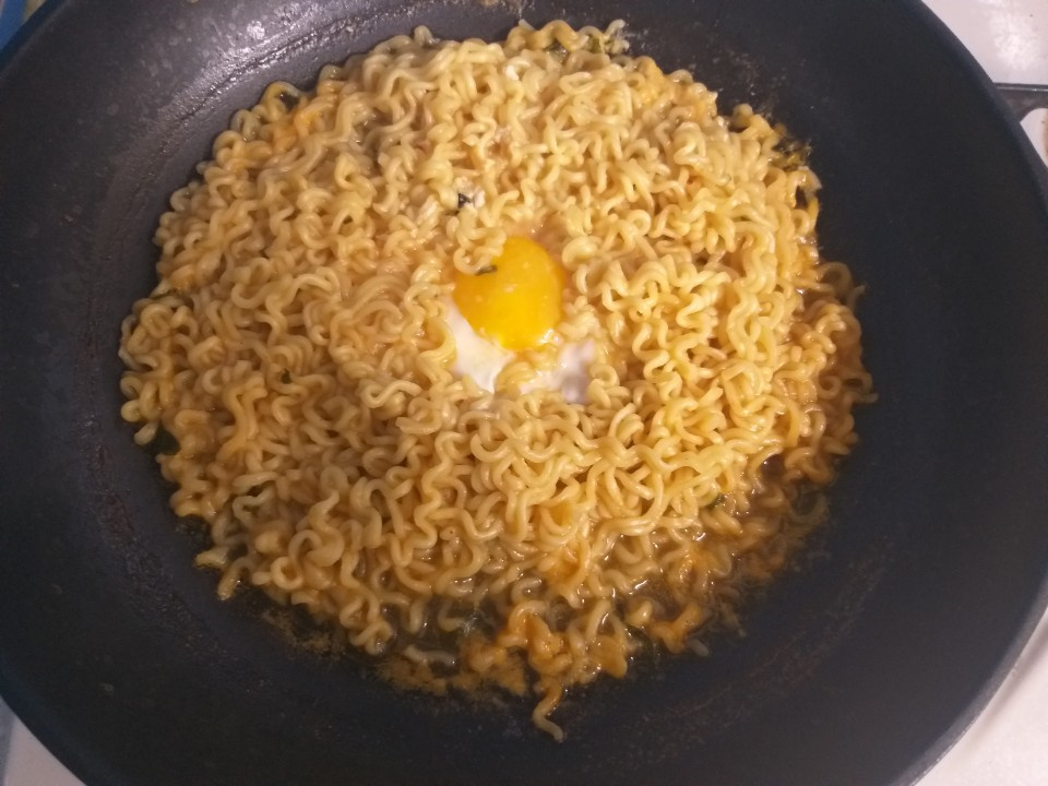 요리에 필요한 재료를 준비합니다. 좋아하는 라면 1봉지 (단, 국물 없이 비벼 먹는 분말 스프 타입은 피해주세요), 물 300ml (약 250~300ml 정도가 적당하며, 사용하는 팬의 넓이에 따라 조절해 주세요), 그리고 신선한 계란 1개를 준비합니다.
