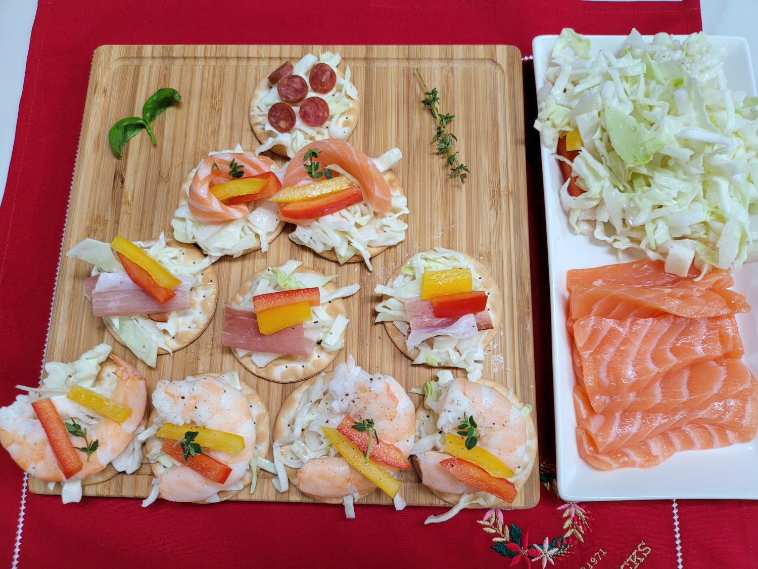 미리 버무려둔 양배추 샐러드를 크래커 위에 보기 좋게 올려주세요. 그 위에 준비한 새우, 연어, 베이컨, 소세지 등 원하는 재료를 취향껏 올려줍니다. 마지막으로 얇게 썬 파프리카와 싱그러운 초록잎(딜, 파슬리 등)으로 장식해주면, 근사한 크리스마스 트리 핑거푸드 크래커 완성입니다! 맛있게 즐기세요.