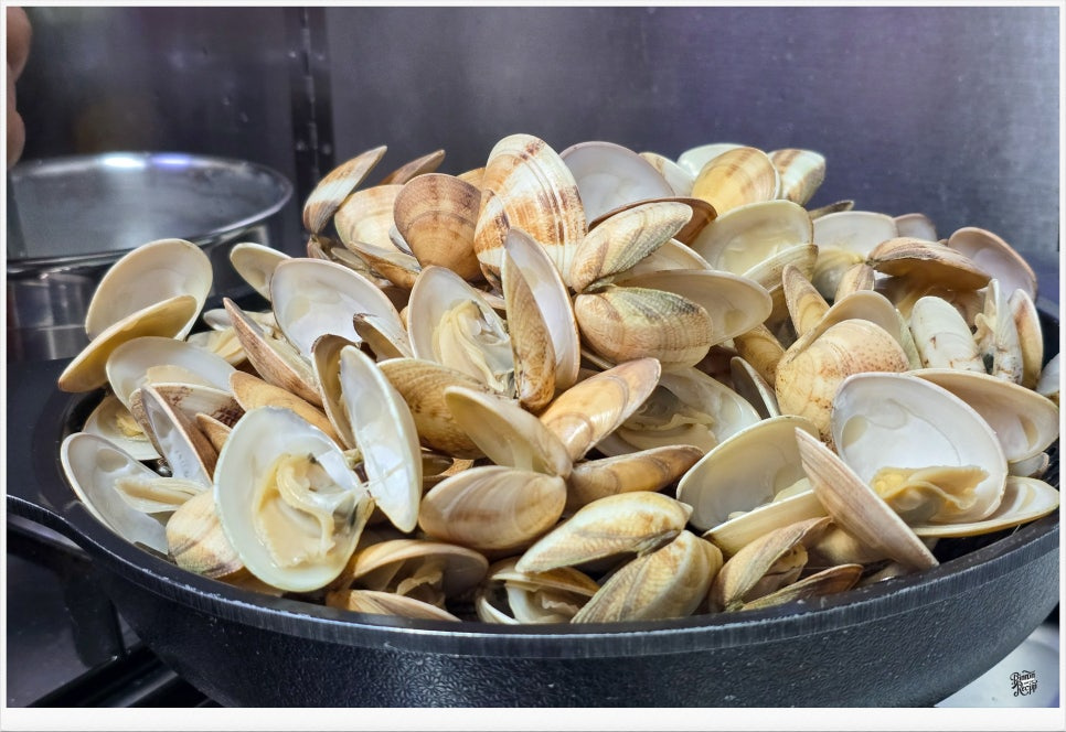 조개가 너무 많으면 냄비를 넘칠 수 있으니, 냄비 크기에 맞춰 조개의 양을 조절하는 것이 좋습니다. 사진처럼 냄비에 너무 꽉 차지 않도록 여유를 두어 담아주세요.
