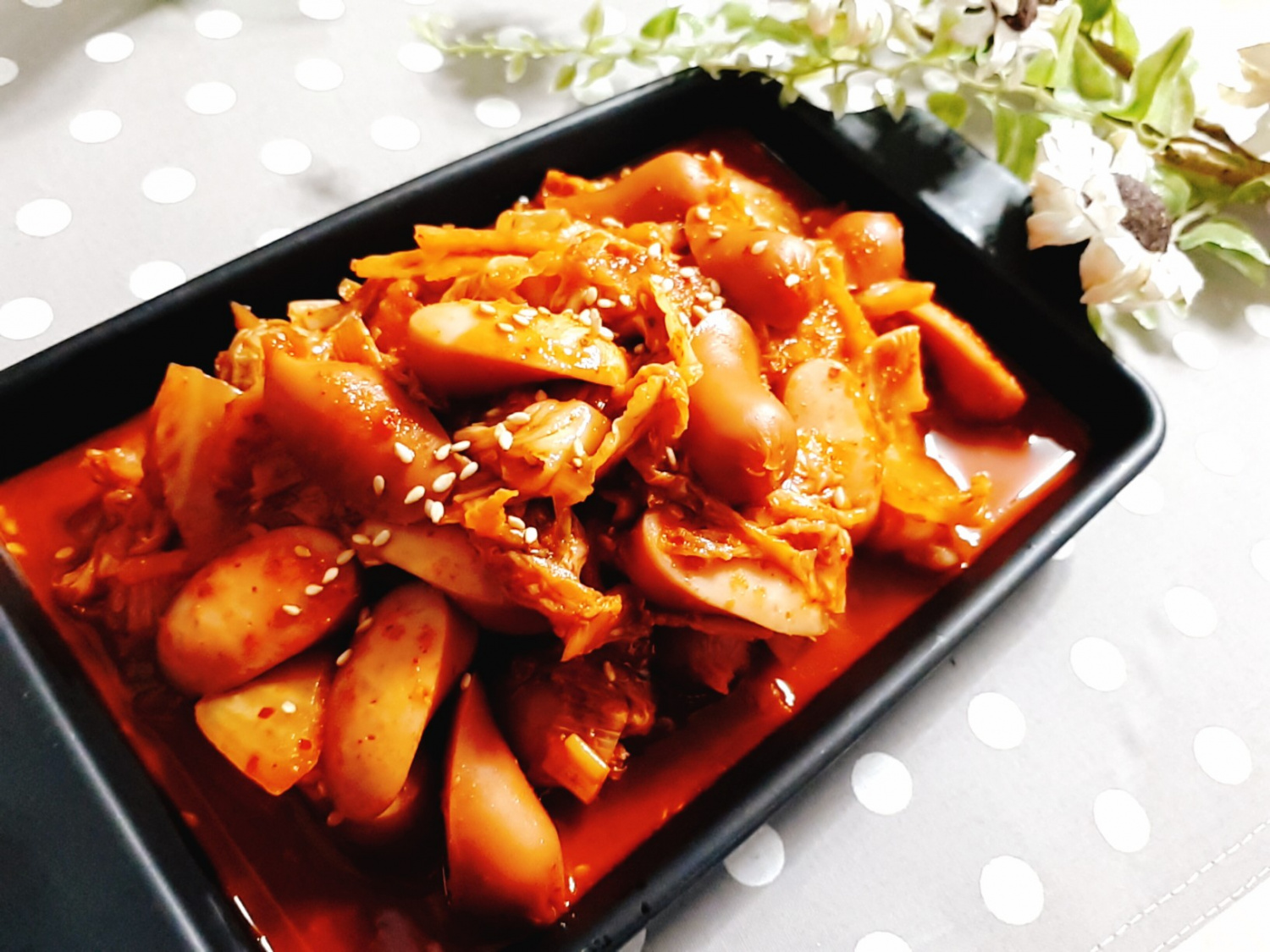 김치를 약 3분간 볶아 양념이 잘 배도록 한 후, 준비해둔 비엔나소시지와 쫑쫑 썬 대파를 함께 넣고 볶아주세요.