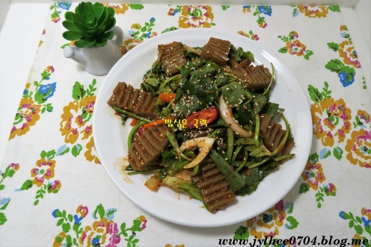 안녕하세요! 밥심은 국력입니다. 도토리묵은 타닌 성분이 풍부한 천연 건강 식품으로, 소화 촉진에 도움을 줍니다. 비록 묵으로 만드는 과정에서 타닌 함량이 일부 줄어들지만, 여전히 모세혈관을 튼튼하게 하고 중금속 해독에 탁월한 아콘산을 함유하고 있습니다. 또한 장과 위를 튼튼하게 하며, 성인병 예방, 피로 회복, 숙취 해소에도 효과가 입증되었습니다. 최근에는 타닌 성분이 지방 흡수를 억제하는 효능 덕분에 다이어트 식품으로도 큰 인기를 얻고 있습니다. 오늘은 맛과 건강, 두 마리 토끼를 잡을 수 있는 참나물과 돌나물을 곁들인 도토리묵무침 레시피를 소개합니다. 야식으로도 부담 없이 즐기기 좋은 메뉴랍니다.