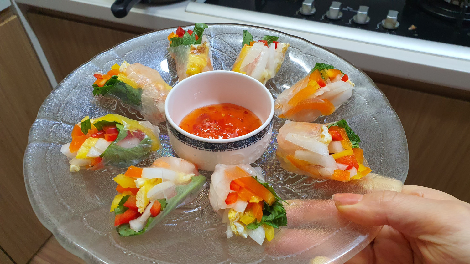 준비된 월남쌈은 칠리소스나 고소한 땅콩소스와 함께 곁들여 냅니다. 취향에 따라 티스푼으로 소스를 월남쌈 속에 살짝 넣어 함께 먹어도 풍성한 맛을 즐길 수 있습니다. 다채로운 색감과 신선한 재료, 그리고 맛있는 소스의 조화로 특별한 식사를 완성해 보세요!