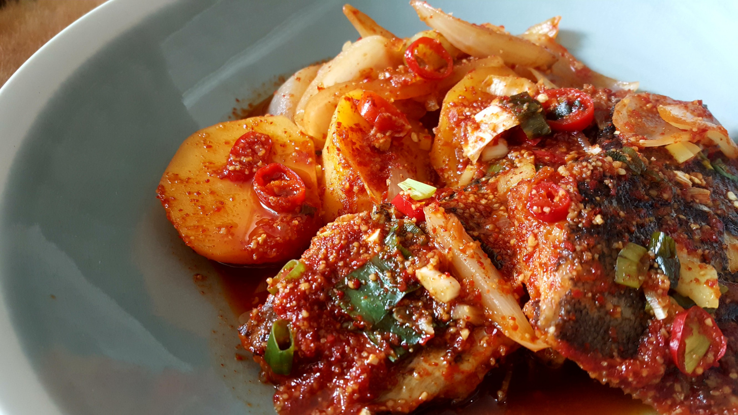 감자와 가자미가 어느 정도 익어서 부드러워지기 시작하면, 썰어둔 양파를 넣고 양념 국물을 중간중간 가자미와 감자에 끼얹어 가며 졸여줍니다. 이렇게 하면 양념이 더 깊게 배어들어 훨씬 맛있어져요.
