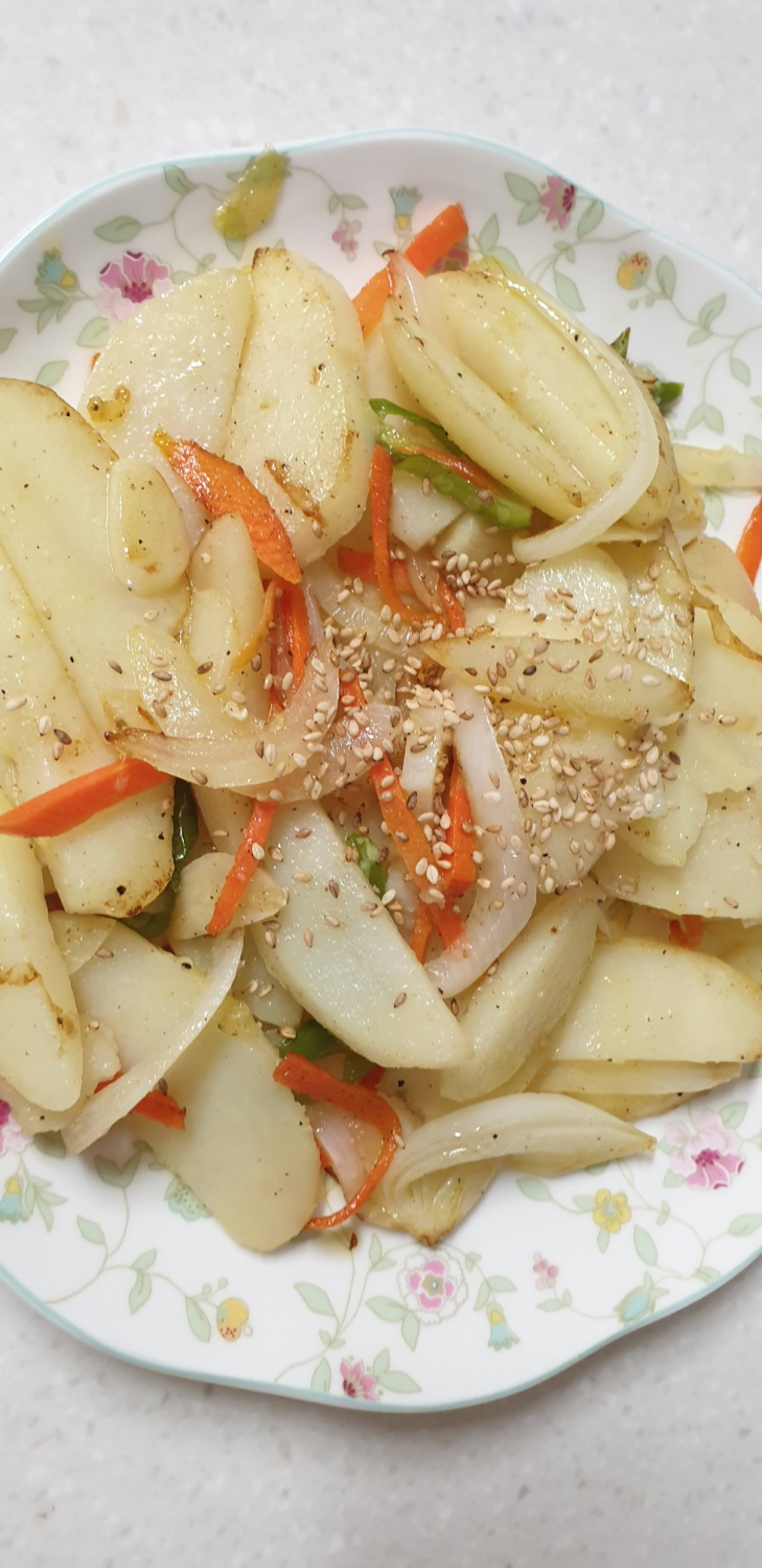달궈진 팬에 준비해둔 모든 재료 – 삶은 감자, 채 썬 양파, 당근, 다진 마늘, 그리고 청양고추(선택 사항) – 를 모두 넣어주세요. 이제 재료들이 팬 안에서 잘 섞이도록 웍질 하듯 가볍게 저어가며 볶아줍니다. 이때 소금을 ‘톡톡톡톡’ 적당량 뿌리고, 후추도 ‘톡톡톡’ 뿌려 간을 맞춰주세요. 취향에 따라 간장이나 굴소스를 약간 추가해도 좋습니다.