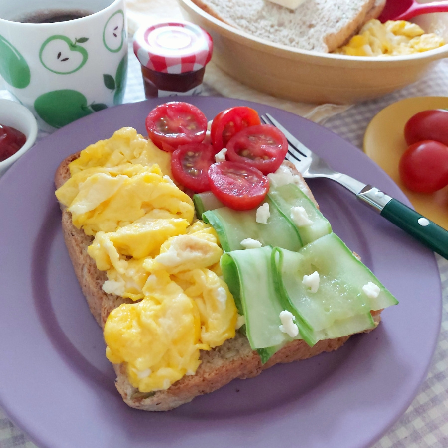 8. 이제 오픈 토스트를 쌓아 올릴 차례입니다. 크림치즈를 바른 빵 위에, 한쪽에는 부드럽게 익힌 에그 스크램블을 듬뿍 올리고, 다른 한쪽에는 물기를 짠 오이를 자연스럽게 반으로 접어 올린 뒤, 반으로 자른 방울토마토를 보기 좋게 얹어주세요. 마지막으로 전체적으로 올리브유를 살짝 둘러주면 근사한 토마토 달걀 오픈 토스트 완성입니다! 이미 오이에 소금 간이 되어 있어 올리브유만으로도 충분히 신선하고 맛있는 풍미를 즐길 수 있습니다. 만약 새콤달콤한 소스를 좋아하신다면, 완성된 토스트 위에 발사믹 글레이즈를 살짝 뿌려주어도 풍미가 한층 더 풍부해져 맛있게 드실 수 있습니다.