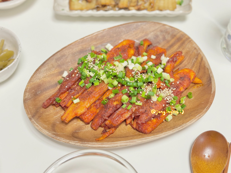 잘 구워진 더덕구이를 먹기 좋게 접시에 옮겨 담습니다. 마지막으로 깨끗하게 씻어 송송 썬 쪽파와 통깨를 솔솔 뿌려주면, 향긋하고 맛있는 더덕구이 완성입니다! 따뜻한 밥과 함께 맛있게 즐겨보세요.