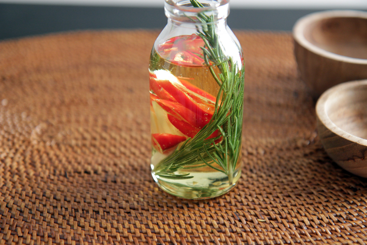 로즈마리 위에 썰어 둔 홍고추를 보기 좋게 넣어 줍니다. 색감이 예뻐져 오일이 더욱 먹음직스러워 보입니다.
