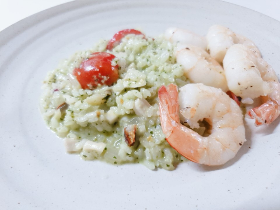 완성된 리조또를 예쁜 접시에 담고, 먹음직스럽게 구운 새우를 곁들여 플레이팅하면 근사한 바질 페스토 리조또 완성입니다! 바질 페스토의 신선한 향과 리조또의 크리미함, 그리고 새우의 풍미가 어우러져 입안 가득 행복을 선사할 거예요. 레스토랑 부럽지 않은 특별한 요리를 집에서 즐겨보세요!