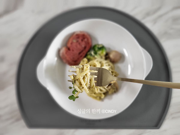 마지막으로 바질 페스토 1 테이블스푼을 넣고 면과 소스가 잘 어우러지도록 섞어주며 최종 간을 맞춥니다. 바질 페스토의 양은 취향에 따라 조절 가능하며, 부족하면 조금 더 추가해도 좋습니다. 모든 재료가 잘 섞이면 맛있는 바질 크림 스파게티가 완성입니다!