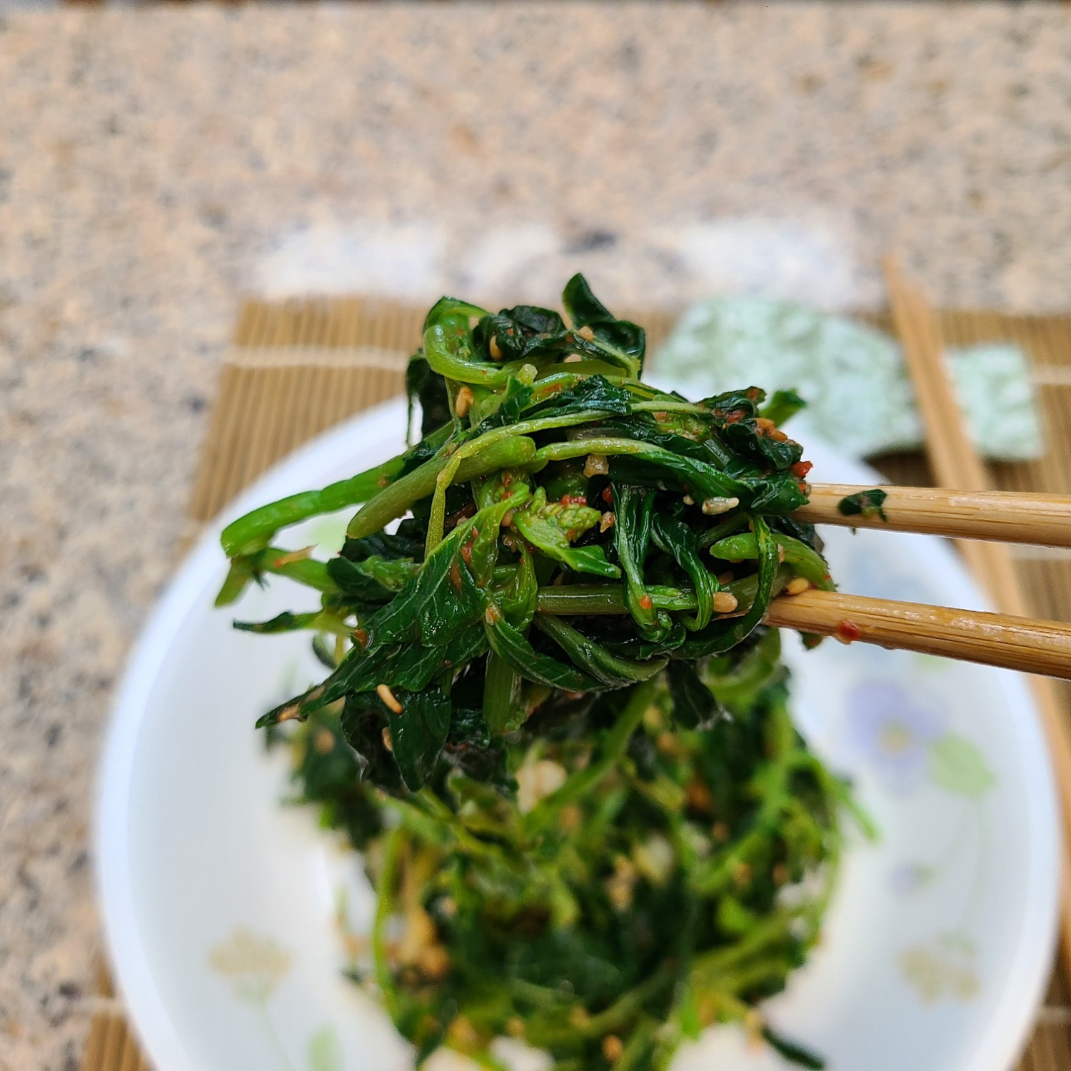 이제 손으로 조물조물 부드럽게 무쳐줍니다. 나물이 뭉치지 않도록 살살 풀어가며 양념이 골고루 배도록 해주세요. 간을 보시고 혹시 싱겁다면 국간장을 아주 조금만 추가해주세요. 너무 짜지 않도록 맛을 보면서 조절하는 것이 중요합니다. 저는 딱 알맞은 간으로 맛있게 즐겼습니다!