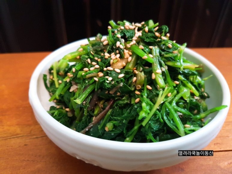 마지막으로 접시에 보기 좋게 담고, 참깨를 솔솔 뿌려 마무리합니다. 이렇게 하면 신선한 향과 아삭한 식감이 살아있는 맛있는 미나리나물 무침이 완성됩니다! 밥반찬으로도 좋고, 비빔밥 재료로 활용해도 아주 맛있답니다.