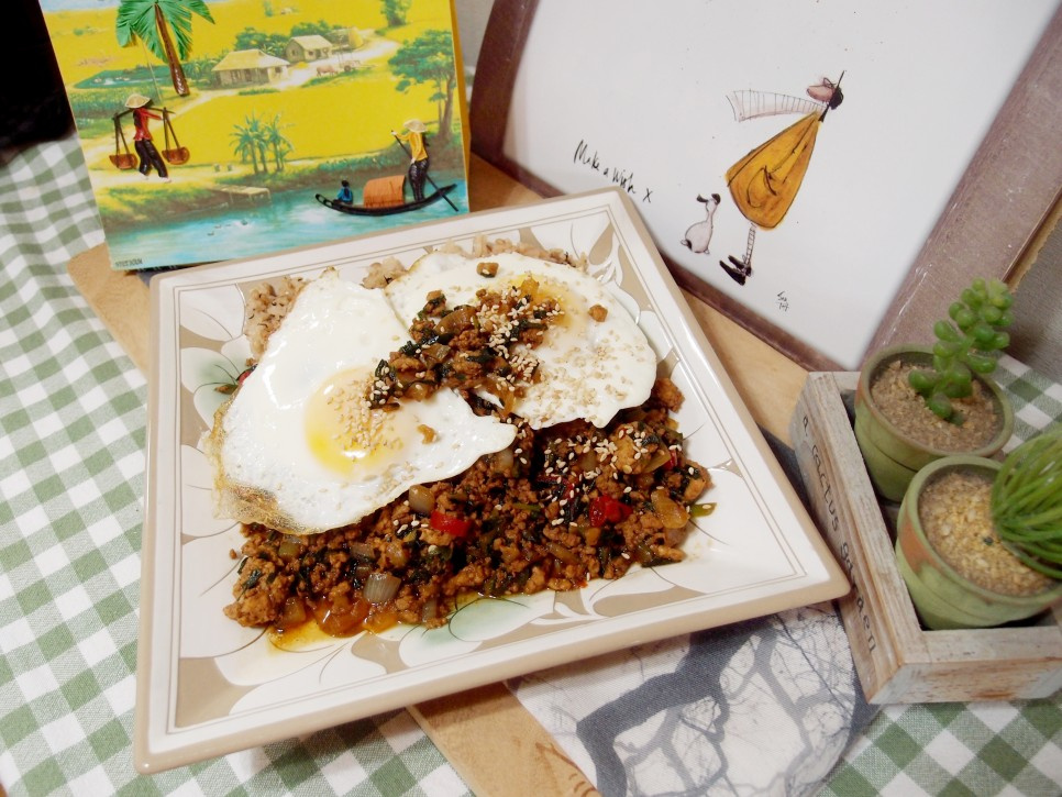 덮밥 위에 올릴 계란 프라이를 준비합니다. 반숙으로 부쳐주면 노른자가 덮밥 소스와 어우러져 더욱 부드럽고 풍부한 맛을 즐길 수 있습니다.
